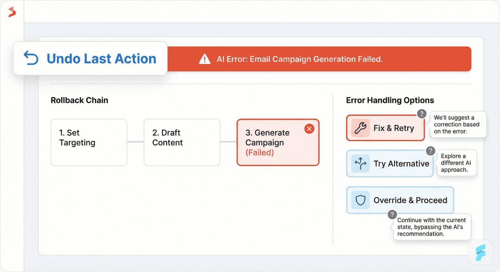 Module 4: "Recovery & Override" Practice session where AI makes an intentional "mistake" and users learn to catch it, roll it back, and guide the AI differently.