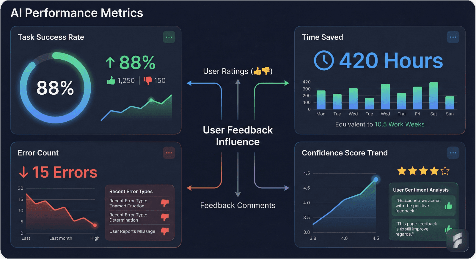 The Problem: Users had no idea if the AI was actually helping. Was it saving time? Making good decisions? Learning from mistakes? Without visibility into performance, users couldn't judge whether to trust the AI more or less.