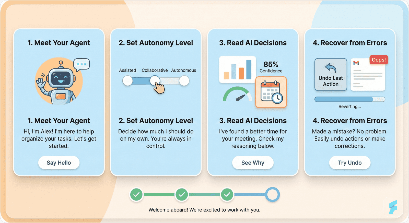 The Problem: Sarah's onboarding taught users how to set preferences. It didn't teach them how to supervise autonomous agents. Users finished onboarding without understanding they were no longer operators, they were supervisors.