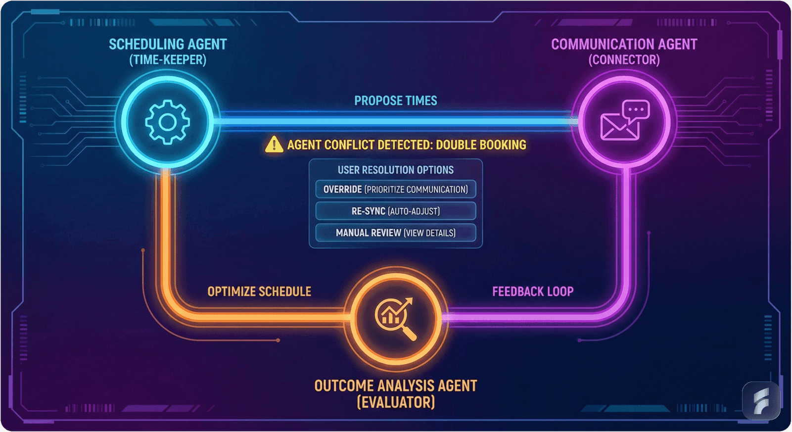 The Problem: Sarah's product didn't just have one AI agent, it had three working together. One handled scheduling, another managed communications, a third analyzed outcomes. Users had no idea this collaboration existed. Things just... happened. Sometimes in contradictory ways.