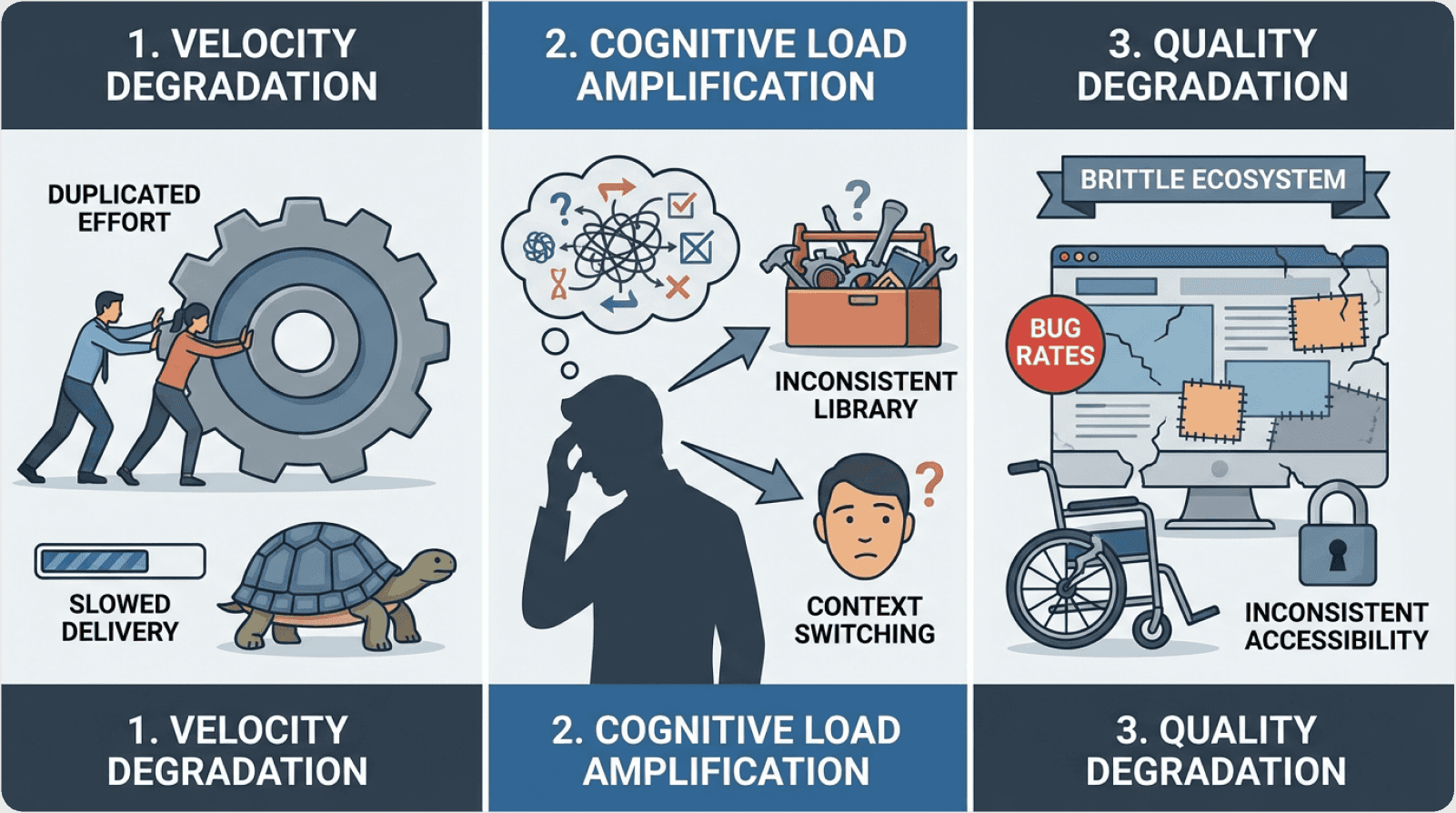 Technical debt emerges from duplicated code, brittle implementations, and maintenance overhead. When teams build similar components repeatedly without shared infrastructure, activation friction increases across the development pipeline.