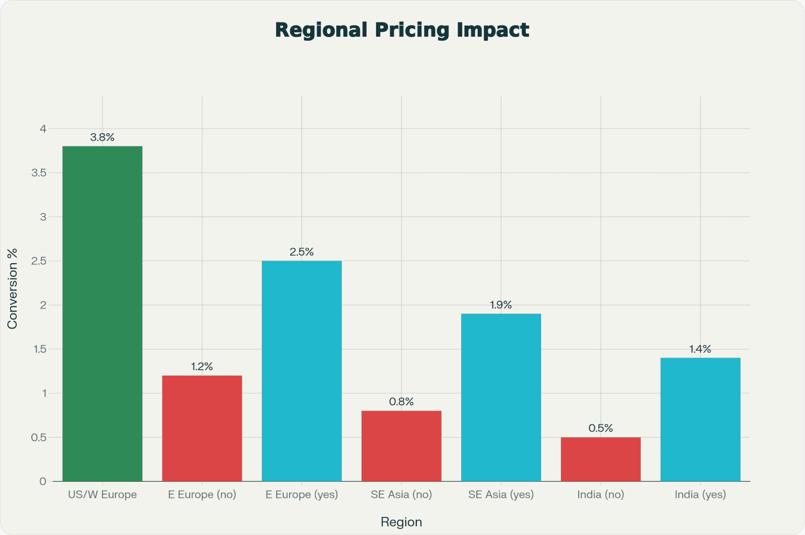 Regional pricing increases global revenue by 25-40% while only reducing average unit price by 15-20%